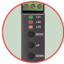 Once the module is configured with internal DIP switches, precise I/O ranges are set up with the front control buttons using a simulator connected to the input terminals and a multimeter connected to the output terminals as a reference. Simply applying the desired minimum and maximum signal levels and press DOWN or UP buttons respectively to store the levels. The front LEDs' colors and flashing patterns help you to easily identify the transmitter's status and confirm the setup actions in each step of Calibration mode.