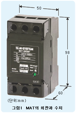 그림1에 MAT의 외관과 수치를 표시합니다. 가로등 분전반 협약형 배선용 차단기주1)의 2극폭(50mm)수치에 맞추었으므로 분전반에 수납하기 쉽습니다. 또 W50×H98×D60mm의 컴팩트한 사이즈이기 때문에 분전반의 설치장소에 제약을 받지 않습니다.