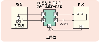 DC전원용 피뢰기(형식:MDP-D24)로 대응할 수 있습니다. MDP-D24의 최대전류는 1A로 되어 있습니다. 모니터 램프가 달려있으며 전원공급시에 점등되며, 전압제한소자에 고장이 났을 경우에는 소등상태가 됩니다. DC24V용 이외에 DC12V용으로서 MDP-D12도 준비되어 있습니다.
