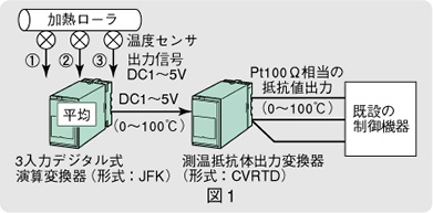 製紙会社から設備更新の話がありました。内容は、加熱ローラの3箇所の温度を測定し、その平均値を測定値と見なして制御しようというものです。ただし、入力先は既設の制御機器であり、その入力信号が測温抵抗体Pt100Ω入力になっています。なお、温度センサからの出力信号はDC1~5Vであり、温度レンジはすべて同じです(0~100℃)。対応可能な信号変換器はありませんか。