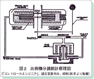 図1は、昭和28年、当時を代表するアマチュア向け電子技術雑誌「無線と実験」の発行社、誠文堂新光社が出版したベストセラーの実用書「コントロールエンジニア」(全4冊)に載っていたHoneywell社の空気式比例調節器の原理図です。紙も印刷技術も不充分な時代の図で見にくいですが、図の詳細よりも時代を味わってください。図中、偏差として動かねばならないところが、単純に測定値の指針に直結していますが、原作者の勘違いでしょう。比例調節機能の効き具合は、フィードバックベローズの動きを伝えるリンク機構のレバー比を変えることで調整する仕組みになっています。調節機能の効き具合は、目盛り盤の上で設定指針と指示指針が、ある偏差まで離れて、バルブが全閉/全開する限界を目盛り幅(%)で表し、比例帯と呼んでいます。計器の目盛り指針の調整と一緒に、調節器の調整もした時代に生まれた言葉なのでしょうか。