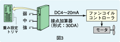 室内温度調整用として用いられるファンコイルのファン風量を切り換える制御をしたいと考えています。ファンコイルの風量調整用入力信号はDC4~20mAです。ファンコイルコントローラによる風量出力は強−中−弱の3点切換えができ、ファンコントローラの入力信号DC20mA、DC12mA、DC6mAに強・中・弱が対応しています。この対応は一度設定すれば、以後変更する必要はありません。スイッチなどによって初期設定することを希望しているのですが、これを実現するのに適した製品はありませんか。
