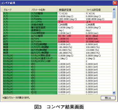 コンペアボタンを使えば、機器設定エリアとファイル設定エリアのパラメータの相違を比較チェックできます。パラメータの相違は赤色で反転表示されるため、大変見やすく、機器管理を行うのに便利な機能です。これらは、機器に書き込まれているパラメータが意図した設定ファイルのパラメータと相違がないかどうか、また、機器に書き込もうとするパラメータと現在書き込まれているパラメータとでどこが違うのかを確認するのに役立ちます(図3)。