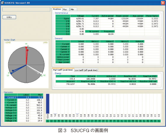 コンフィギュレータソフトウェア(形式:53UCFG)注2)をエム・システム技研のホームページからダウンロードしてお使いいただくことにより、パソコン上で電力マルチメータ 53Uの設定編集、設定のファイル管理、編集画面の設定値と機器の設定値の比較表示などが可能になります。機器前面からでも同じ内容の設定は可能ですが、53UCFGを使用することによってはるかに短時間で簡単に処理できます。