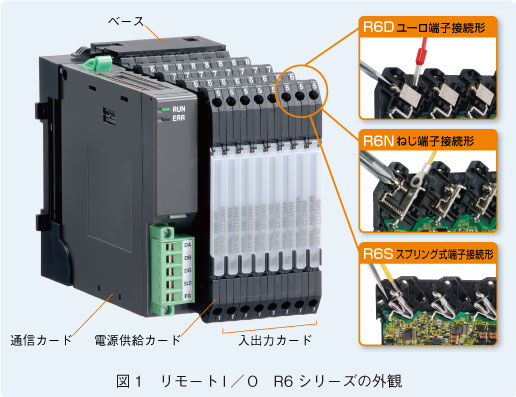 R6シリーズの構造は、R3シリーズ、R5シリーズと同じで、ベース、電源供給カード、通信カード、入出力カードから構成されています(図1参照)。