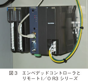入出力機器についてですが、以前からいろいろなシステムで使用していたMsysNet機器には、計器ブロックを使ってアナログ積算や上下限警報チェックなどの演算機能、および簡単なシーケンスなどを組めるという優れた特長があります。そこで、この特長を引き継いでいるエンベデッドコントローラ(形式:R3RTU-EM)を採用することにしました。R3RTU-EMは、入出力機器としては、最新のリモートI/OシリーズのひとつであるR3シリーズを組み合わせることができるため、増設にもかかわらず、設置スペースを十分確保することができました(図3)。R3RTU-EMでは、経験済みの計器ブロックを使用できるため、システム移行のやりやすさと安心感を実感できました。結果として、短納期にも対応できました。
