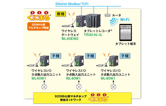 たとえばModbusの通信機能をもった記録計に「くにまる®」の親機を接続すると、この「くにまる®」のネットワークに入力された全ての現場の計測信号が入力信号となった記録計が誕生します。もちろん「タブレットレコーダ®」に接続して、全ての現場の計測値を持ち歩ける記録計画面として利用することも得意業の一つです。