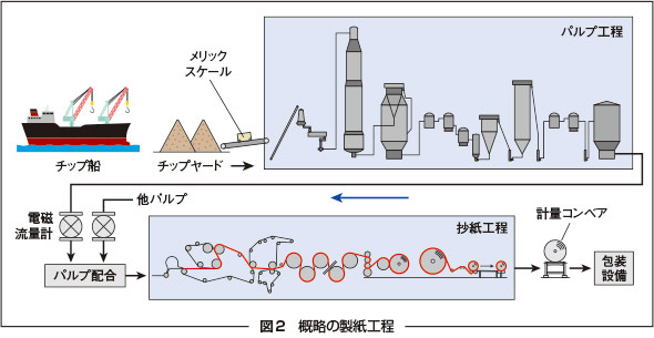 図2は製紙工場の全体工程を簡単に書いたものです。紙の原料である木材チップは国内材のほかに多くは大型船で海外から搬送されてきます。主工程はパルプと抄紙ですがこれらの生産区切りには各種センサが設置されて生産量を特定して生産効率を知ることができるようにしています。製紙では「歩留まり」という用語を使いますが木材から紙製品に至る過程には良質なパルプを取出す結果、繊維以外のものや含まれるチリを除去することで原料は目減りします。さてチップ船にはインボイス(内容物証明書)が付いてきます。工場内に入って木材チップはヤードに野積みされた後にメリック(コンベア)スケール、パルプ(スラリー状液体)を計測する電磁流量計、そして最後に計量コンベア(台秤)で製品の重量を計測します。これらセンサの中で最も正確なのは台秤でこれは独立したコンベア上で計測できることとロードセルの高性能にあります。次に電磁流量計ですが、これはある意味製紙産業のために開発されたようなものでパルプスラリーの流量を測るには他に代わるものがありません。ただし筆者の駆け出しのころはまだ初期段階とされ、パルプから抄紙に移るラインでは電磁流量計を同じ配管に2台直列に取付けている工場がありました。重要性の認識はされていたが信用されていなかったということです。