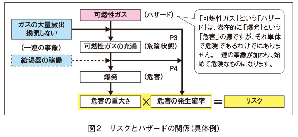 「可燃性ガス」という「ハザード」は、潜在的に「爆発」という「危害」の源ですが、それ単体で危険であるわけではありません。「ガスの大量放出」と「換気しない」という事象に、さらに「給湯器の稼働」という事象が加わり、初めて危険なものとなります(「ハザード」は、一般的には悪者ではなく、本来は有用なものです)。