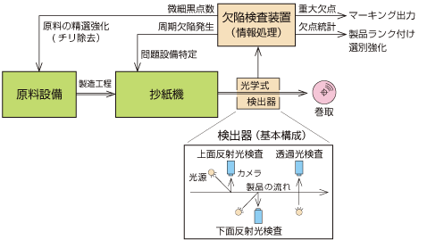 シート表面検査装置は、鋼板、フイルム、製紙など連続製造される製品の欠陥を光学的に検出するものをいいます。シート状の製品が巻き取られる直前に投光器と受光カメラを配置して、製品の主に表裏面を監視して品質の向上に貢献するものです。欠陥の判別には初期設備であってもラインセンサと称して高速で流れる製品の幅方向にカメラを多数配置して欠陥の大、中、小の判定をし、とくに紙製品では透過光により穴や地合いを、反射光により黒点や汚れの区別を行うことができました(図2)。しかしその当時は欠陥発生のアラームが出ても後工程で実物を確認するまでは詳細な欠陥内容がわからないものでした。