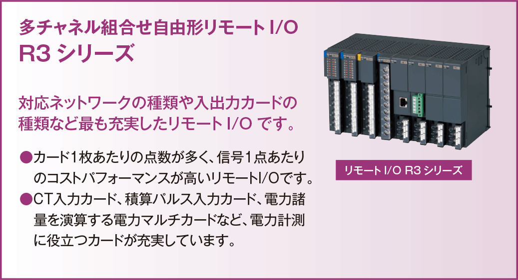 あるデータセンターでは今後更なる省エネを実現するため、分電盤やサーバラックなど細かな単位での電力消費量を監視することになり、多点数の信号を取込めるリモートI/O R3シリーズが採用されました。