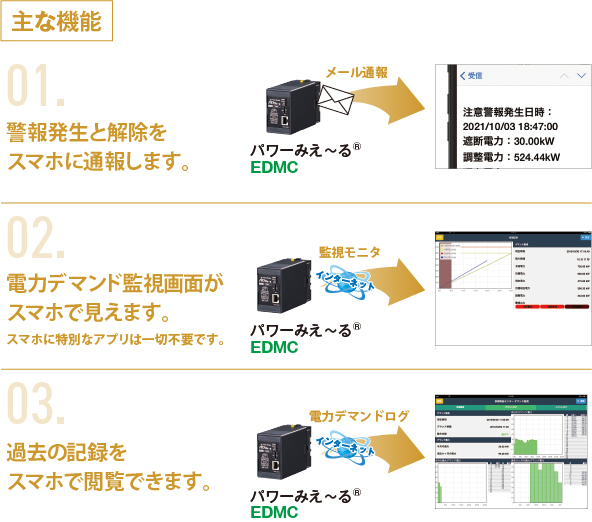 ある電気小売事業会社では、工場や施設ごとに電力料金(契約電力)の抑制を目的とした電気の見える化サービス(デマンド監視サービス)を行っています。このサービスにパワーみえ〜る®(形式:EDMC)が標準採用されました。パワーみえ〜る®は消費電力の状況をグラフ化し、PCやスマホで確認(見える化)することができます。さらにデマンド予測を行い、目標電力(契約電力)を超えそうな場合は、警報メールを担当者に送信するほか、オフィスのデスクトップ上で積層形表示灯を点灯できます。PCで最大需要電力(デマンド)や、電力使用量のデータ管理ができ、何より、簡単・安価に見える化システムを構築できる点が評価されました。