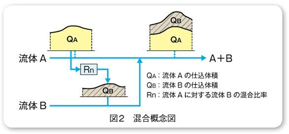 このように制御すれば、流体Aの流量が変動しても、流体Aの仕込体積QAと流体Bの仕込体積QBの混合比率Rn(割合)は常に一定となります(図2)。