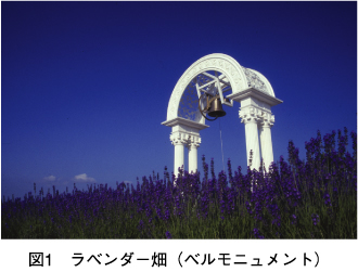 北海道上富良野町は、北海道のほぼ中心富良野盆地の北部、秀峰十勝岳のふもとにある人口12400余の町です。産業は農業を基幹とし、ラベンダーと温泉がある観光の町という特徴ももっています。上富良野町はラベンダー発祥の地で、毎年、日の出公園では「花と炎の四季彩まつり」が開催され、紫のじゅうたんの上で1組限定の「ラベンダーウエディング」が行われ、1日限りの世界一美しい結婚式として、ラベンダー畑は一層格別な雰囲気に包まれます(図1)。