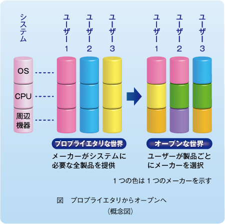 しかし、時代と共にこのプロプライエタリな壁は崩れてゆき、各社が共通な接続仕様の下でハード、ソフトの製品を分業するようになりました。プロプライエタリからオープンな世界に変わってきたのです。また、ソフトの中身をオープンにして、共同で開発しようという運動も起きました。