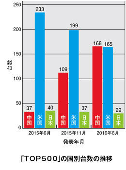 上位500台に占める台数は、中国が168台で1位、米国が165台で2位でした。ちなみに日本は29台で3位です。1年前の2015年6月には、米国は233台で1位、中国は37台で3位だったので、この1年の中国の躍進ぶりには驚きます。