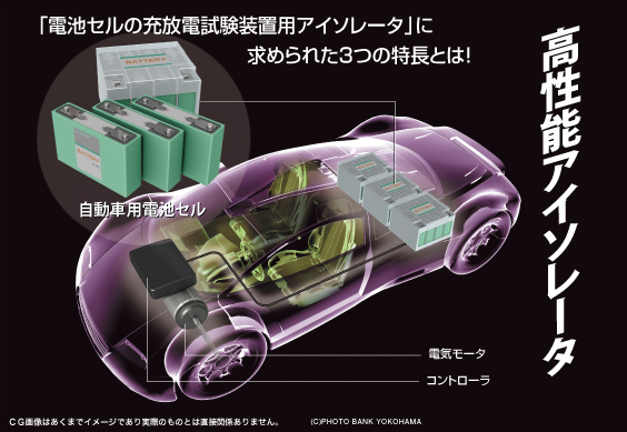 電気自動車用ニッケル水素電池やモバイル機器用リチウムイオン電池など、エコの面でも携帯性の面でも、電池は日常生活に欠かせない存在になりました。この電池の開発・生産において、性能・品質検査を行う「充放電試験装置」はとても重要な役割を担います。その「充放電試験装置」で信号の絶縁・変換を行う高性能アイソレータを新たに開発しました。
