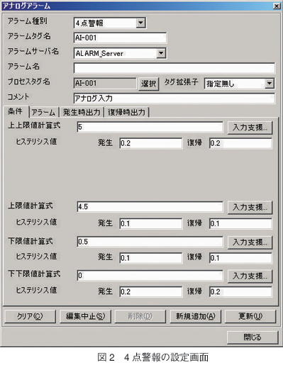 図2は4点警報の設定画面です。1チャネルのアナログ入力に対して上限・上上限・下限・下下限アラームを設定する際には従来の方法では、それぞれ4つのアナログアラームタグを登録し、それぞれのプロパティ画面にてそれぞれの発生条件を設定する必要がありました。しかし今回、アナログアラームタグのアラーム種別に「4点警報」を追加したことにより、1つのタグ、1つのプロパティ画面にて4つのアラームの登録が可能になり、効率の高いエンジニアリング作業ができるようになりました。