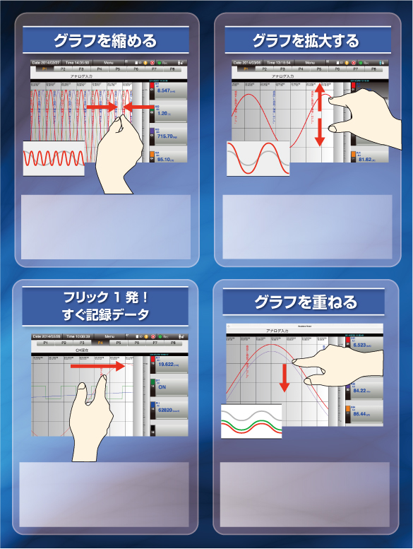 長い時間の変化や長いインターバルを置いた変化は、ピンチインでグラフを縮めれば一目瞭然です。 過去方向(画面右方向)にフリックするとシームレスにヒストリカル画面に移行します。 2つのグラフのうち一方を移動してもう一方に重ね、変化の違いを比べることができます。 微妙な変化のグラフは、振幅方向にピンチアウトすると変化を拡大して見ることができます。