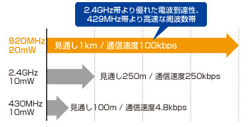 920MHz帯無線は2012年7月に法制化された新しい無線カテゴリであり、無線LAN2.4GHz帯や特定小電力無線430MHz帯に比べ、安定した通信品質と高い電波到達を実現します。