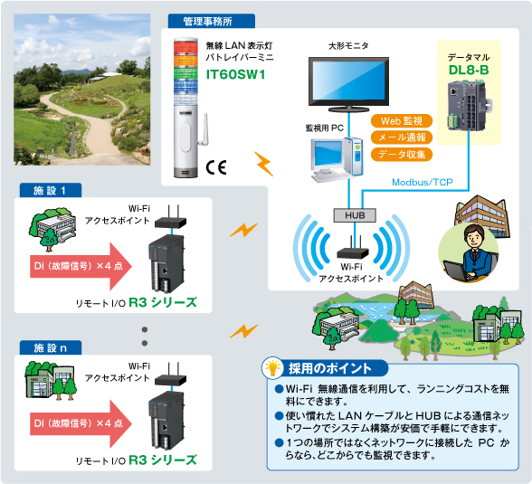 ■ データマル®(タイプB)を使用した簡易監視システムです。Wi-Fiアクセスポイントを使用して無線により通信します。
