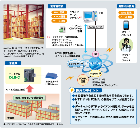 ■ 農業団体などが管理する米倉庫では、良質米を販売するために庫内の温度、湿度が重要な管理項目であり、これらの値をデータマル®で監視します。