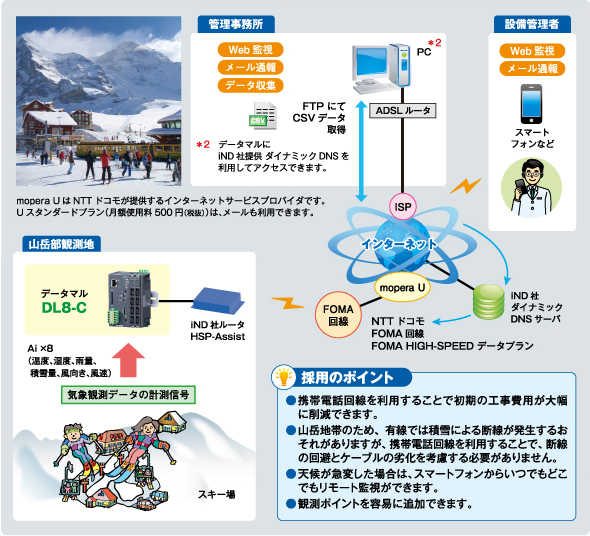 ■ 山岳部にあるスキー場では、積雪により事故が発生するおそれがあるため、気象データを利用して緊急措置の要否を判断します。山頂付近の気象観測のデータ(温度、湿度、風向き、風速、雨量、積雪量などの計測値)をデータマル®で遠隔監視します。