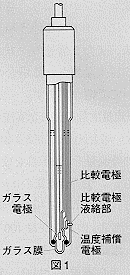 | pH計とは水溶液の酸性アルカリ性の程度を測る計器で、(社)日本分析機器工業会の統計によれば、とびぬけて生産台数が多い計測器です。pH測定の用途は非常に広範囲で、工場における製品製造の工程管理から、工場排水や河川水の公害監視に至るまで様々です。また形状についても、使用形態に対応して、ハンディ型、卓上型、定置型などがあります。 測定方式としては、指示薬式、アンチモン電極式、ガラス電極式などが実用化されています。 1.pHとは 従来の表現によれば、pHとは水溶液中の水素イオン(H+)濃度を表わす単位であり、希薄溶液ではpH=-log10(水素イオン濃度)と定義されていました。 水素イオン濃度の実例は、表1に示すように中性では10-7mol/L、0.1NのHClでは10-1mol/L、0.1NのNaOHでは10-13mol/Lとなり、非常に小さい数で実用上取扱いが煩雑になります。そこで、濃度の対数をとりマイナスの符号をつけると、それぞれ1、7、13と簡単な数値になるので、この単位をpHとしています。 2.JISの改訂 pH測定に関して、1983年から1984年にかけてJIS規格に大きな変更が行われました。変更されたのは、pH測定方法(JIS Z 8802)とpH標準液の規格(JIS K 0018~0023)であり、これによって測定方法がガラス電極法に限定され、pHは、pH標準液によって目盛り付けされた(校正された)pH計で測定された値と考えてよいことになりました。 3.ガラス電極法 ガラス電極法とは、水溶液のpHに比例した起電力を発生するガラス電極と、電位測定のための基準電位を与える比較電極を一対にして試料水に浸したとき、両電極間に発生するpHに対応する起電力を出力するpH電極と、目盛り付けするための機能を有しているpH指示変換器とを組み合わせて測定する方法です。比較電極には内部液(KCl溶液)が入っていて液絡部から少量ずつ流出させる構造をとっているため、内部液の定期的な補充が必要です。 3.1 pH電極 pH電極の起電力の理論値は、水温25℃では、1pH当たり59.16mVであり、温度が変化すると1℃当たり0.198mV変化します。これを補正するため、多くのpH計には温度補償電極が組み合わされています。そして現在は、ほとんどの電極が、ガラス電極、比較電極、温度補償電極を一体にした、扱いやすい複合型の電極構造を採用しています。 複合型pH電極の構造例を図1に、pH電極の起電力特性を図2に示します。 ガラス電極pH計では、pH1からpH13の間でpH値と電極電位差(検出器出力)とが、ほぼ直線の関係にあります。なおpH1以下では酸誤差、pH13以上ではアルカリ誤差のため直線性が悪くなっています。 ■