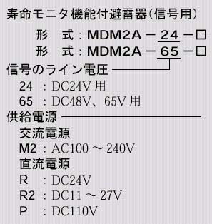 ●機器仕様 構 造:薄形プラグイン構造 ハウジング材質:難燃性黒色樹脂 警報接点:放電素子および電圧制限素子の劣化時、または寿命到達時にON(B接点) ●定格負荷: AC125V/0.5A、DC30V/1A ●最大開閉電圧/電力:AC125V/62.5VA、DC110V/30W 異常表示ランプ ●RUN:緑色LED 補助電源供給時に点灯 ●ALARM(ALM):正常時には消灯 放電素子が仮想寿命に達するまでの残りサージ回数が、あと10回以下になると橙色に点灯 サージ吸収素子の劣化時または放電素子の仮想寿命到達時に赤色に点灯 劣化判定:サージ吸収素子の漏れ電流値が約7.5μAで劣化と判定 寿命判定:放電素子の放電回数が400回になった時点で寿命と判定 ●設置仕様 供給電源 ●交流電源:AC85~264V AC100Vのとき 約0.6VA AC200Vのとき 約1.5VA ●直流電源:R :DC24V±10% R2:DC11~27V P:DC85~150V ●性 能 放電開始電圧(波高値) 線間:DC30Vmin.(MDM2A-24-□) DC70Vmin.(MDM2A-65-□) 線-接地間:±290Vmin. 制限電圧 線間:DC45Vmax(MDM2A-24-□) DC85Vmax(MDM2A-65-□) 線-接地間:±650Vmax. 応答時間:0.1μs 放電耐量:5000A(8/20μs) 最大負荷電流:100mA 内部直列抵抗:約20Ω 洩れ電流: 線間、線-接地間:5μA max. DC30Vにて(MDM2A-24-□) DC70Vにて(MDM2A-65-□) 最大線間電圧: 30V(MDM2A-24-□) 70V(MDM2A-65-□) (2)電源用避雷器(MAA)