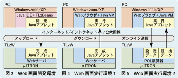 1)インターネット、イントラネット、構内LAN、CATV網、地域IP網、公衆電話回線、ISDN、PHS、DoPaなど、普及した様々の通信インフラを活用する。 2)Web画面方式とEメール方式をとることによって、管理コンピュータや携帯電話側には標準的なWebブラウザやメール受信ソフトさえあればよく、ユーザー固有のアプリケーションソフトを必要としない。 TL2Wには標準機能として7つのWeb画面が組み込まれていて、ユーザーは導入後直ちに利用することができます。さらに必要に応じて、ユーザー固有のグラフィックWeb画面(Javaアプレット)を簡便に作成して併用することができます。本稿では、このアプリケーション画面の作成手順と機能の実現方法を例題画面図2と表1によってご説明します。