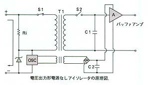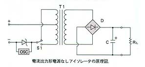 スイッチS1を閉じトランスT1の一次側に電流が流れ込みます。一次側に流れ込んだ電流にともなって2次側にアイソレーションされたエネルギーが蓄えられます。スイッチS1を開きS2を閉じると蓄えられたエネルギーは、コンデンサで平滑されバッファアンプへ電圧として与えられます。これを交互に繰り返しバッファアンプから出力信号DC1~5Vを取り出します。スイッチS1、S2の開閉とバッファアンプ動作用の電力は発信器(OSC)から提供されます。