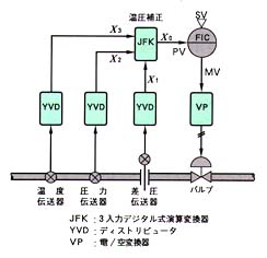 今回は“3入力デジタル式演算変換器”(□JFK)を対象としてプログラミングユニット(PU-2)の使い方を紹介します。JFKは差圧式ガス流量計の温度・圧力補正、または加減・乗除算などの演算を行う3入力、1出力のデジタル式演算変換器です。今回は下図のように差圧式ガス(スチーム)流量計の温度・圧力補正(質量流量演算)を行う場合を例に、プログラミングユニットの操作方法を紹介します。