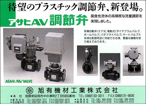 プラスチックの高性能、高機能化を背景に金属バルブからプラスチックバルブへの代替があらゆる分野で進められています。計装の分野においてもこの傾向は必至であり、アサヒAV調節弁の果たす役割は大きく、必ずご期待にそえるものと考えています。
