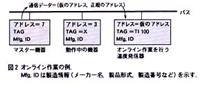 バス上には、ネットワーク上のすべてのノードの構成情報を持つマスター機器が必ず存在することとします。その機器が(1)、(2)のステップを終えた機器の仮のアドレスに機器の様子を問い合わせると機器の製造情報(メーカー名、製品形式、製造番号など)やタグ名が返答されます。返答されたタグ名がシステム全体のタグ名とだぶらなければマスター機器は該当機器の正式なアドレスを割り付けます(図2)。