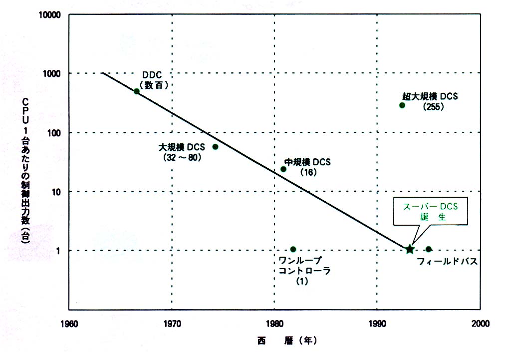 上図に示すように、1台のコンピュータで処理する制御出力数は、コンピュータの進歩およびICの高密度化に比例して少なくなってきました。1960年代に出現したDDC(Direct Digital Control)システムは、1台のコンピュータで全工場の操作端(コントロールバルブ)のPID制御を行っていました。
