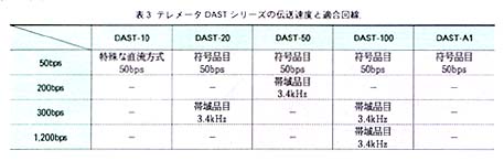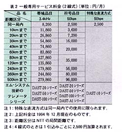 大阪/0120-18-6321 用サービス”があります(図1参照)。 この“一般専用サービス”は特定区間に回線を設置する方式であり、ホットラインとしての即時性、定額料金による経済性と共に、利用目的に応じたメニューが豊富であるなどの特長をもっています “一般専用サービス”には帯域品目と符号品目の2つの区分があり、それらの中にさらにいくつかの品目があって、それぞれ用途が決められています(表1)。テレメータはこれらの品目の中から帯域品目の3.4kHz、符号品目の50bpsそして特殊な直流方式を使用します。 これらの“一般専用サービス”を利用するためには、回線新設時に施設設置負担金などとして2線式で1対向分約170,000円の費用と毎月定額の回線使用料(表2)が必要です。 エム・システム技研では、DASTシリーズとして豊富な実績のもとに多種類のテレメータをそろえており、使用する回線の種類や伝送速度、伝送信号の種類などに応じて選択することができます(表3)。ただし、特殊な直流方式は回線の利用が同一局内に限られますので、伝送区間が同一局内にあるかどうかを確認しておく必要があります。 |