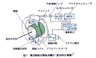 上記のような一般用電磁流量計以外に、特殊な電磁流量計があります。たとえば、電池駆動式です。これは愛知時計電機が開発したもので、内蔵のリチウム電池で10年間の連続測定が可能です。原理図を図1に示します。これは励磁コイルの中に磁気保持力を持つ特殊磁石材料を入れ、磁界を反転させるときのみ、電流を流す残留磁気励磁方式を採用し、超低消費電力化を実現しています。