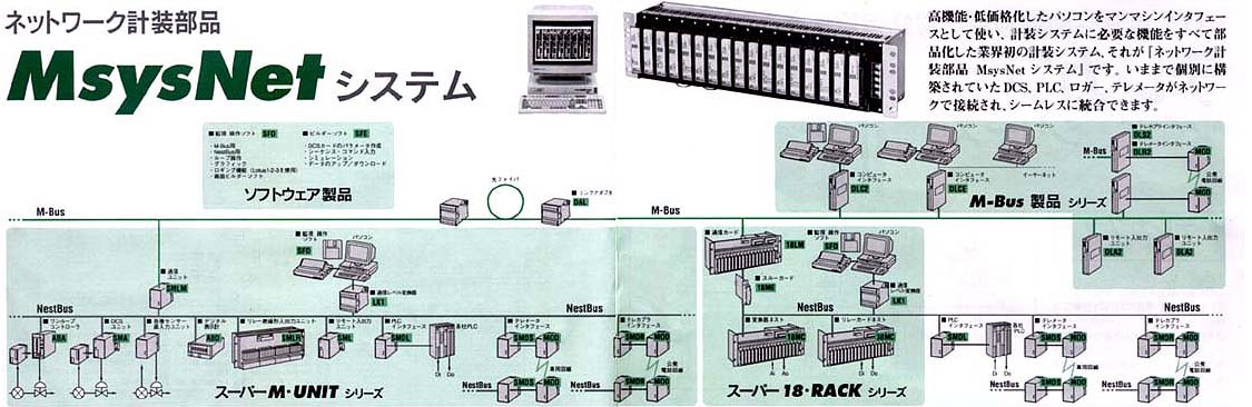 MsysNetシステムはパソコンをマンマシンインタフェースとし、プラグイン形のハウジングを基本とする“スーパーM・UNITシリーズおよびネスト収納を基本としたカード形のスーパー18・RACKシリーズで構成されています。両シリーズは、いずれも1ループごとのPIDコントロールを可能にしたDCSユニットやDCSカードを初め、計装システムに必要な機能(ソフトも含めて)をすべて部品化した形で構成されています。これら部品化されたユニット(またはカード)はM-BusとNestBusのネットワークで接続され、一体となって機能します。