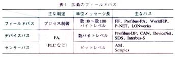 現在発表されているフィールドバスおよびこれに準ずるバス(広義のフィールドバス)はおよそ50種類に達しています。これらを分類すると、表1に示す3種類に分けられます。ここに示したデバイスバス・センサーバスは、主としてPLCと結合するバスであり、比較的小規模のシステムを構築するのに用いられています。これらは扱う情報量は少ないが、通信プロトコルを実現する半導体チップが安く入手できるものが多く、FA(ファクトリーオートメーション)分野では普及しています。ただし本稿ではこれ以上の説明は省略します。