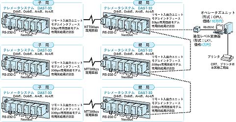 DAST-30は、NTT専用回線を使ったテレメータ装置です。符号品目50bpsの回線用と3.4kHzの周波数帯域を使った300bpsの回線用との2種類の伝送方法があります。接点信号のみ片方向の場合は最大32点、アナログ信号のみ片方向の場合は最大16点伝送することができます。