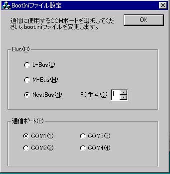 PC番号が重なっているためと思われます。 ひとつながりのNestBusには、カード番号を持った機器、たとえばワンループコントローラ(形式:ABE、ABH、ABA)や入出力ユニット(形式:SML)とは別に、最大4台までのOPUを接続することができます。NestBusに接続するOPU(監視・操作ソフト SFDN)にはPC番号が設定されています。この番号が重なると、通信ができません。 標準出荷されたOPUは、PC番号が“0”になっています。このPC番号を変更するときには、エクスプローラーを使って、Cドライブにある\Msysnetというホルダーの中にある“BootIni.exe”のアイコンをダブルクリックしてソフトを立ち上げます。ソフトが立ち上がると、「BootIniファイル設定」のウインドウが開きます。このウインドウ画面は、初期値(デフォルト)ではM-Busが選択されていますので、NestBusにチェックを入れます。すると、PC番号が設定できるようになります。PC番号の初期値は0ですので、2台目のときには1にします(下図)。 OPUでなく、SFDNをソフト単体としてご購入いただいたときには、SFDNをパソコンにインストールしたとき、この「BootIniファイル設定」ウインドウが開きます。インストール時の設定を後から変更する場合には、上述したOPUの場合と同じように“BootIni.exe”を起動して、設定しなおします。 ここで注意しなければならないことは、“BootIni.exe”を起動したとき、常にデフォルト値に戻っていることです。したがって、M-Bus以外を使用しているときには、必ずBusの設定を確認してください。 |