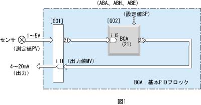 ●フィールド端子ブロック(ABAの場合は形式:F06、ABEの場合は形式F52、ABHの場合は形式:F53、Group 01)(以下、GroupはGと略します) ●基本PIDブロック(形式:21、Group02) フィールド端子(G01)と調節器ブロック(G02)2つのブロック間の結線については、図1のようになっています。