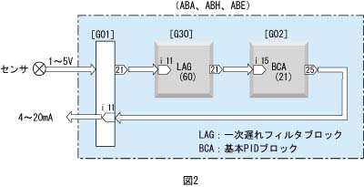 PV入力値に一次遅れフィルタを入れたい場合 2つの方法があります。 (1)Group02を拡張PIDブロック(ECA、形式:22)に変更し、一次遅れ時定数に適切な値を設定します。 (2)フィールド端子ブロックと基本PIDブロックの間に、一次遅れフィルタブロック(LAG、形式:60)を入れ、一次遅れ時定数に適切な値を設定します(図2参照)。