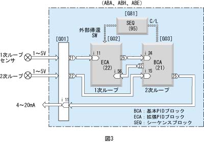 図2のように、一次遅れフィルタブロックの代わりに別のブロックを使ったり、複数のブロックを追加することも簡単にできます。 2次ループにカスケード制御を入れたい場合 Group02に拡張PIDブロック(ECA、形式:22)を設定します(図3参照)。
