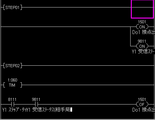 尚、SFDNで回線断を表示させる時には、SMDM(SMM)の計器の中で下記の様な回線断を検出するシーケンスを親局のSMDM(SMM)で組み、機器間伝送端子に割り付ける必要があります。 下記の例は、親局側のG15に登録されたDo送信端子のDo1接点出力から、回線正常時にオンを出力する場合のシーケンスです。 ステップ01で異常検出用端子(下例ではGroup15端子01)と、専用回線端子(形式:98)の受信ステータス端子を常時オンにします。ステップ02で は、相手局から正常に信号が伝送されてくるたびに、受信ステータスがオフになります。すると、すぐにステップ01にブランチし、ふたたび受信ステータスをオンにします。通信が正常に行われていると、この動作を繰り返します。 テレメータが断線して、相手から信号が途絶えると、受信ステータスはオンになりっぱなしになります。このためステップ02から01へブランチすることができません。ステップ02にはステップ監視タイマを組み込んでおきます。下の例では、60秒に設定しておりますので、60秒間、ステップ02の 中で処理を繰り返すと、このシーケンサブロックのステップ監視タイマ完了接点(端子11)オンになりAND条件が成立して、異常検出の端子をオフにします。 子局側でも同様の回線断検出が必要な場合は、同じシーケンスを子局側で組みます。
