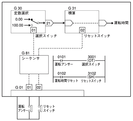 接点信号から、運転時間を積算するには、75)定数選択ブロックと68)積算(瞬時値入力)ブロックを組み合わせて使用すれば実現可能です。 下図に、具体的構成例を示しておきますが、まずは定数選択ブロックにてON時とOFF時の時間換算計数を生成します。すなわち、ポンプ運転中時は、積算ブロックに100%の値を入れ、運転停止時は0%の値を入れるようにします。そのため、ポンプ運転中のON/OFFのアンサー信号を受けシーケンスブロックにて定数を切替、積算ブロックではその数値を常時積算することにより、運転時間としてカウントすることが出来ます。