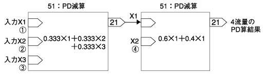 - (1)〜(3)の加算を行います。この3つの流量は全て同じレンジとなっているので下記の式を用いて加算します。