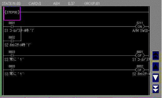PIDブロックの端子番号11、A/M切替スイッチを電源起動時にのみSETすればプログラムは完成ですが、残念ながら、Gr80システム内部スイッチには、”起動時のみON”といった接点は用意されていないので、シーケンサブロックにて作成する必要があります。 下図に、シーケンスブロックのサンプルを添付しておきます。参考にしてみてください。