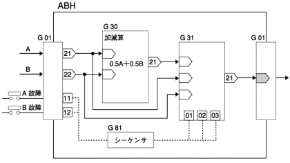 発信器からのアナログ信号2点を演算し、平均値の出力を考えています。ただし、どちらかの入力信号が発信器の故障で正常に入力されなかった場合、正常な方の信号のみをそのまま出力させたいのですが、良い方法はありませんか? 発信器の故障信号(接点信号)は出力します。