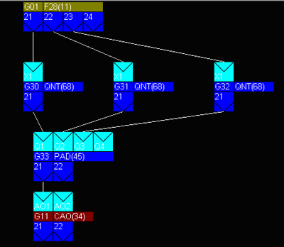 瞬時値積算は積算(68)で行います。1パルスあたりの重みは積算率を変えてあわせます。 その結果をパルス加算(45)で加算します。 例として、フィールド端子から3点の流量瞬時値を読み込み積算後、積算値を伝送端子(Group11)にわたす「アナログ接続図」を示します。 【アナログ接続図】